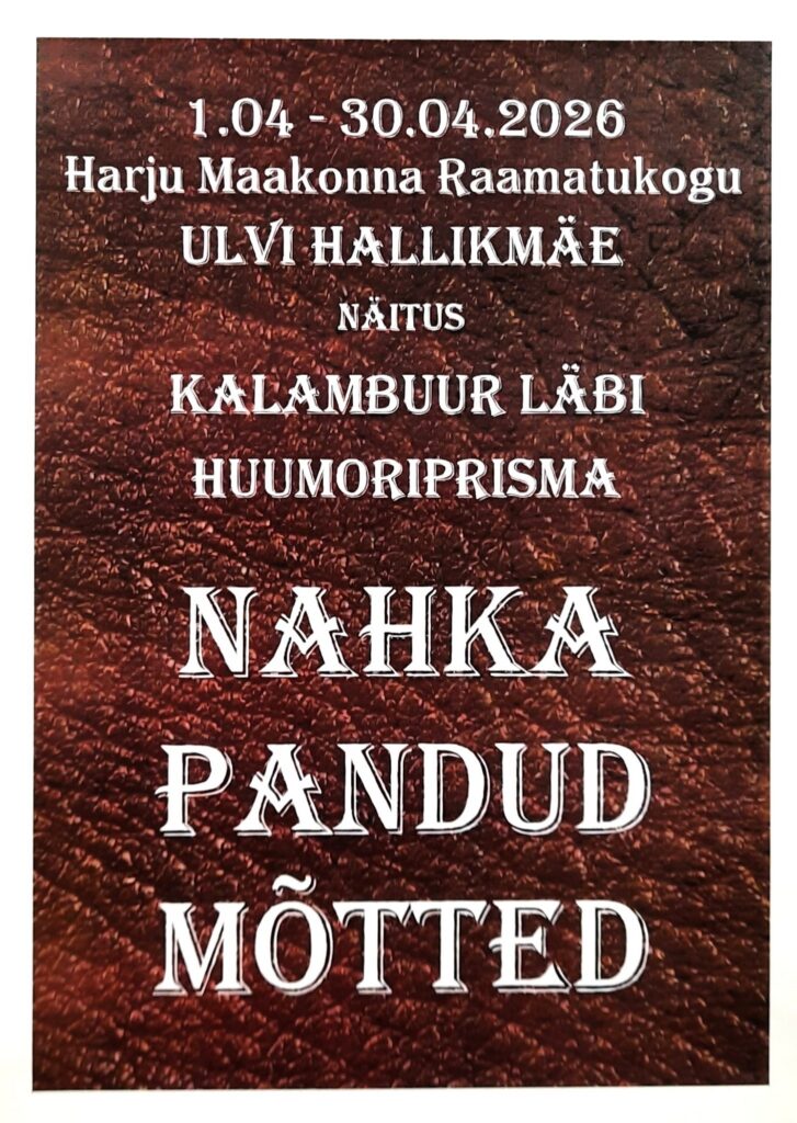 Harju Maakonnaraamatukogu Oranžil seinal on Ulvi Hallikmäe näitus Nahka pandud mõtted.